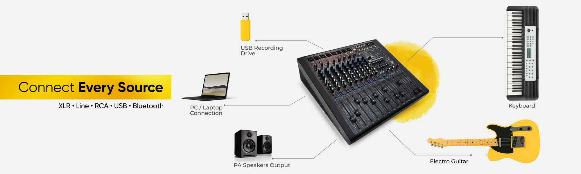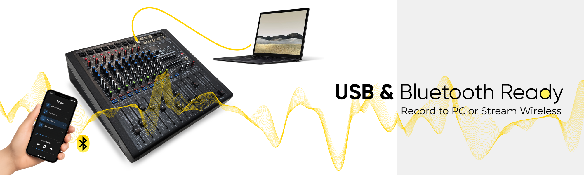 With multiple XLR, line, and USB inputs, it functions as a USB audio mixer, audio mixer XLR, and sound board for PC. Built-in Bluetooth makes it a reliable Bluetooth mixer or DJ mixer Bluetooth, while direct USB recording supports creators needing a studio mixer, pc audio mixer, or audio mixer for streaming.