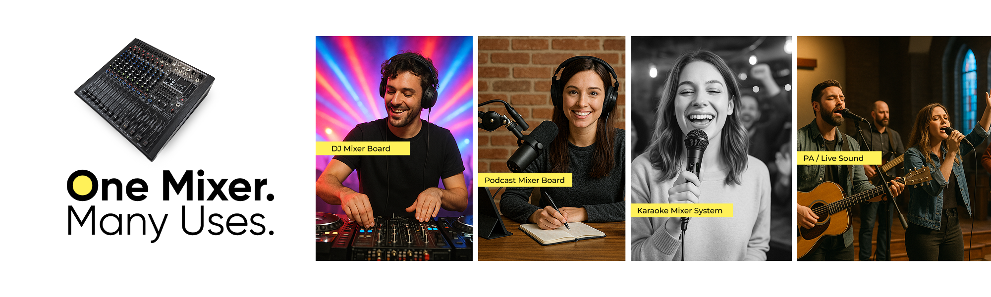 - Professional DJ mixer board and sound mixer with multiple inputs, including XLR mixer connections. Compact enough to function as a mini mixer audio setup yet powerful for DJs, bands, and events.