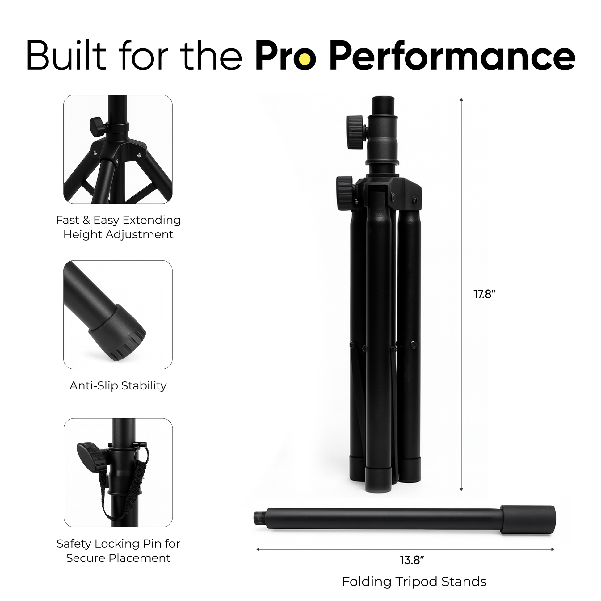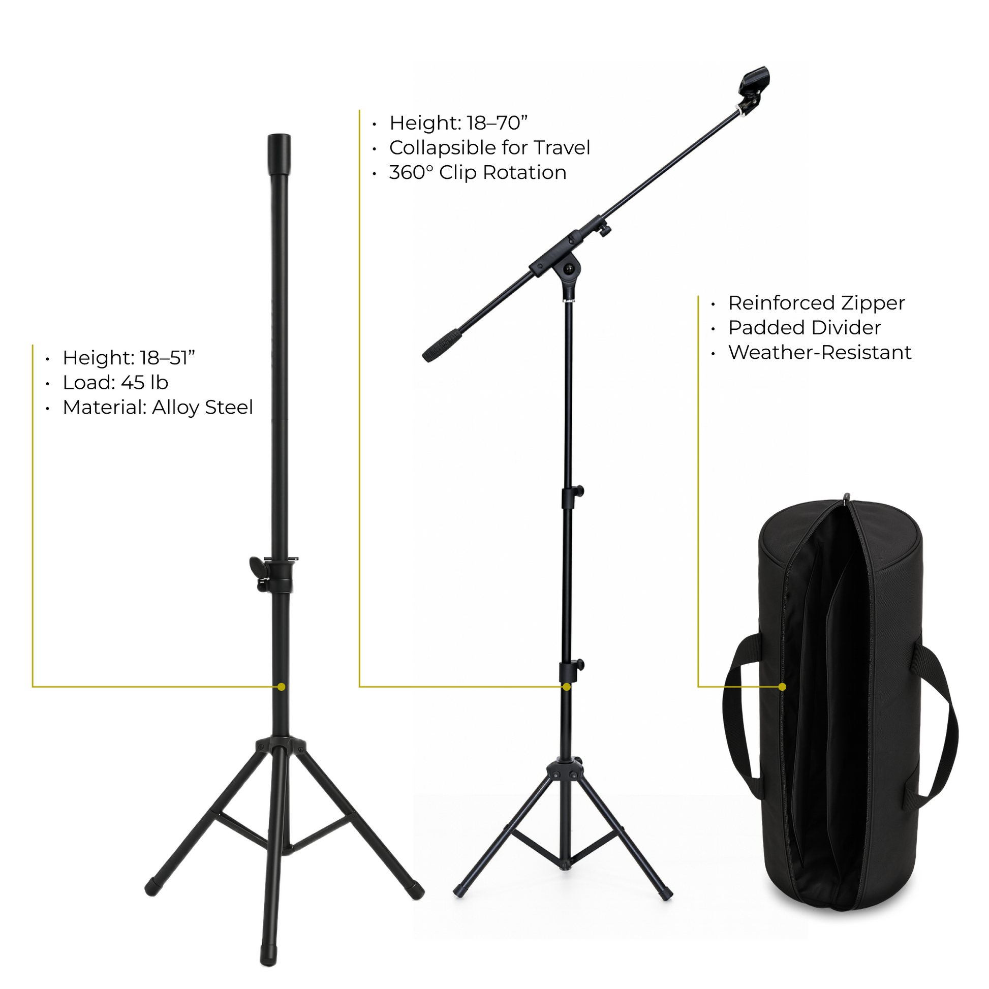 - Mic Stand Height: 18–70”, Collapsible for Travel, 360° Clip Rotation
